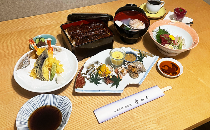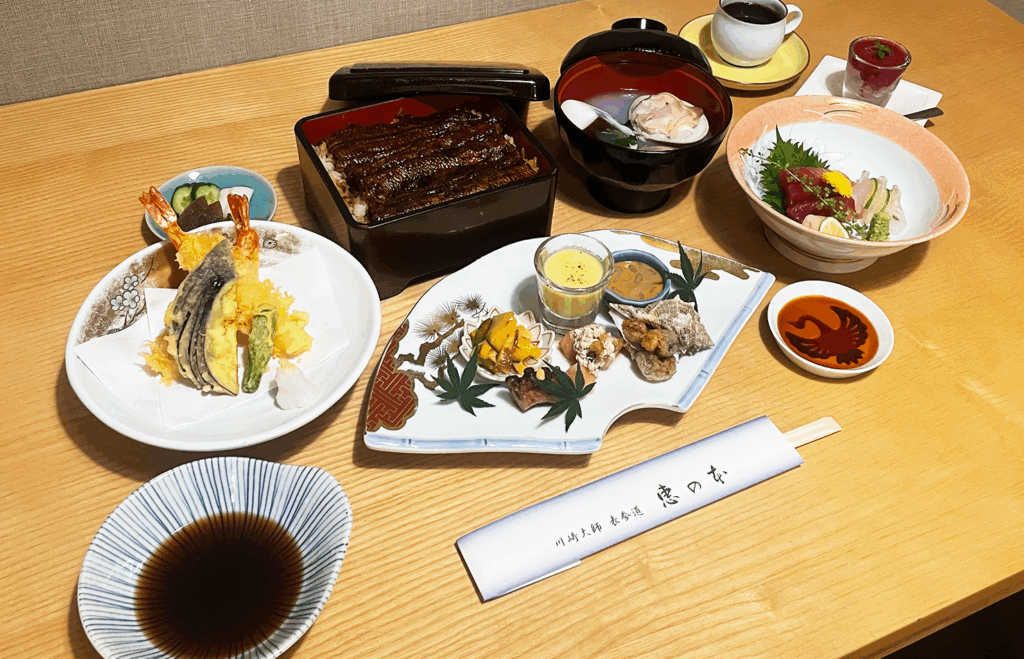 前菜 お造り 天ぷら お食事 一尾の鰻重とお椀 デザート