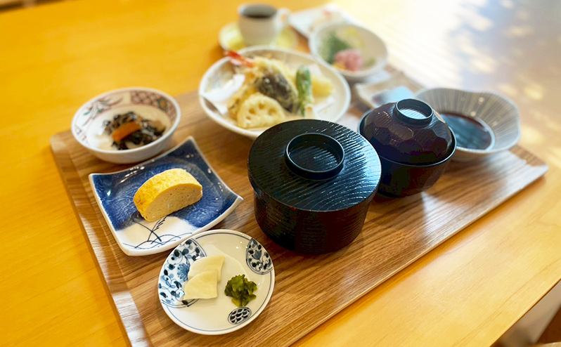 前菜 お造り 天ぷら お食事 鴨ロース丼とお椀 デザート 珈琲